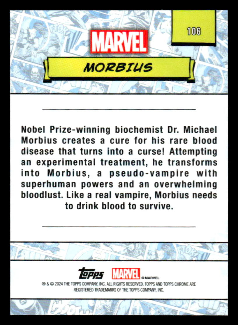 This is a nice example of a 2024 Topps Chrome Marvel #106 Morbius .Other important information about this card: .Please check out our other listings for more great cards.