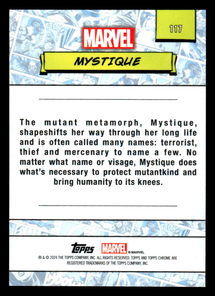 This is a nice example of a 2024 Topps Chrome Marvel #117 Mystique .Other important information about this card: .Please check out our other listings for more great cards.