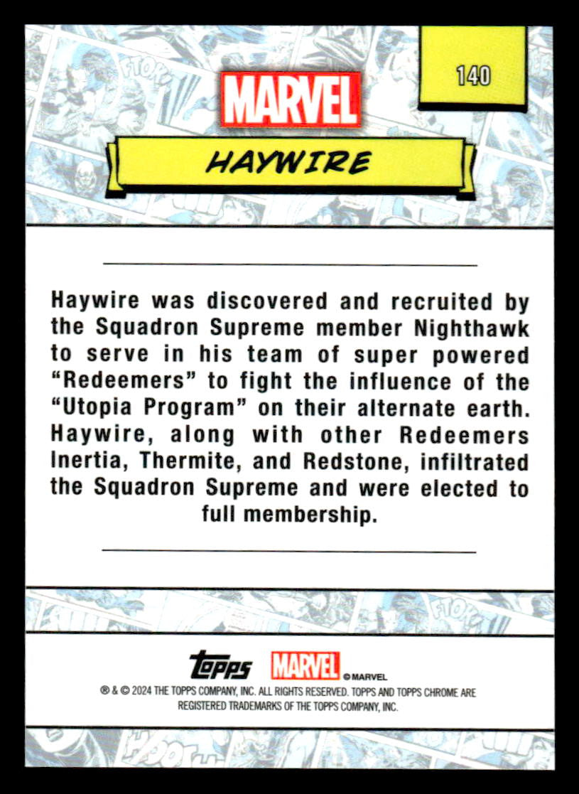 This is a nice example of a 2024 Topps Chrome Marvel #140 Haywire .Other important information about this card: .Please check out our other listings for more great cards.