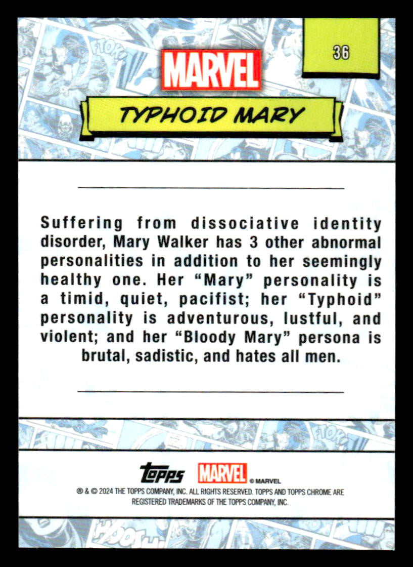 This is a nice example of a 2024 Topps Chrome Marvel #36 Typhoid Mary .Other important information about this card: .Please check out our other listings for more great cards.