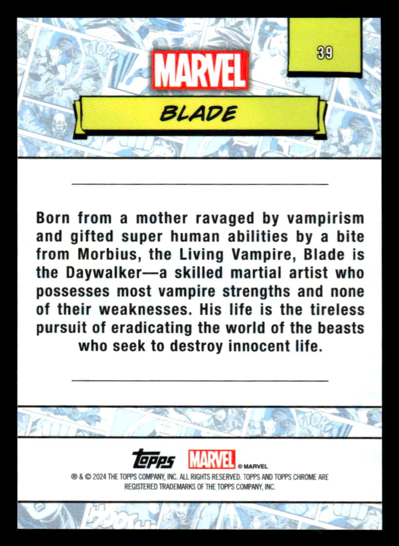 This is a nice example of a 2024 Topps Chrome Marvel #39 Blade .Other important information about this card: .Please check out our other listings for more great cards.