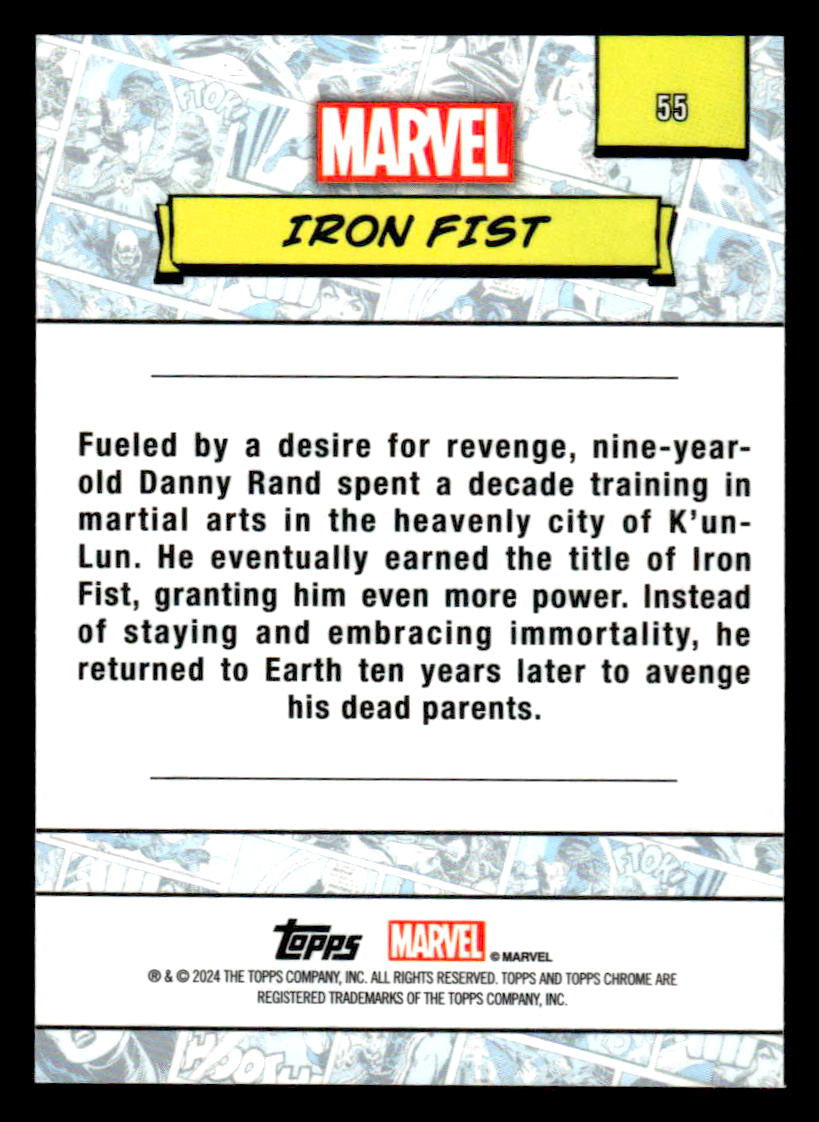This is a nice example of a 2024 Topps Chrome Marvel #55 Iron Fist .Other important information about this card: .Please check out our other listings for more great cards.