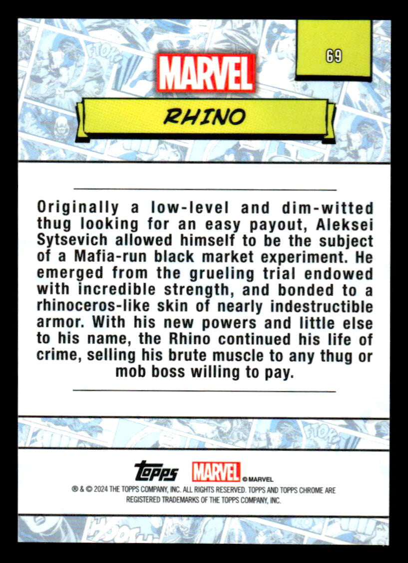 This is a nice example of a 2024 Topps Chrome Marvel #69 Rhino .Other important information about this card: .Please check out our other listings for more great cards.