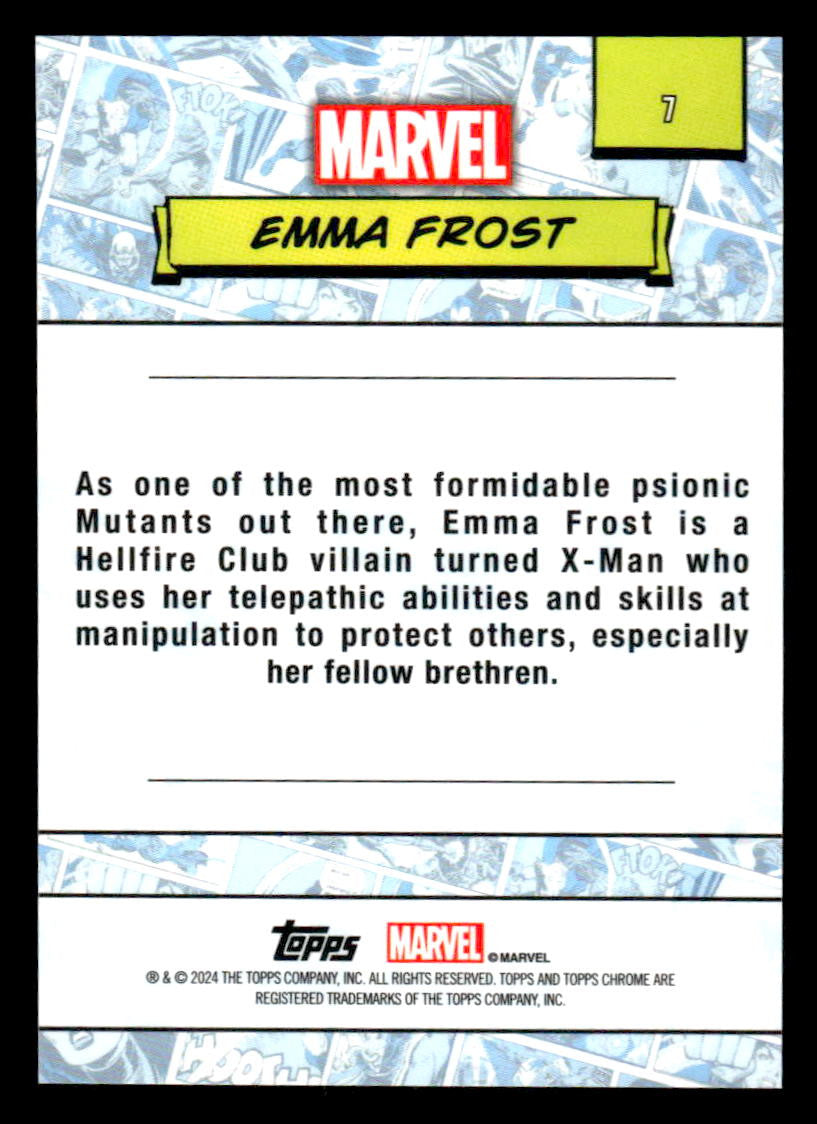 This is a nice example of a 2024 Topps Chrome Marvel #7 Emma Frost .Other important information about this card: .Please check out our other listings for more great cards.