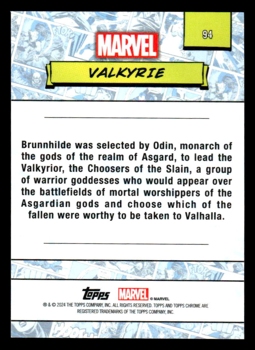 This is a nice example of a 2024 Topps Chrome Marvel #94 Valkyrie .Other important information about this card: .Please check out our other listings for more great cards.