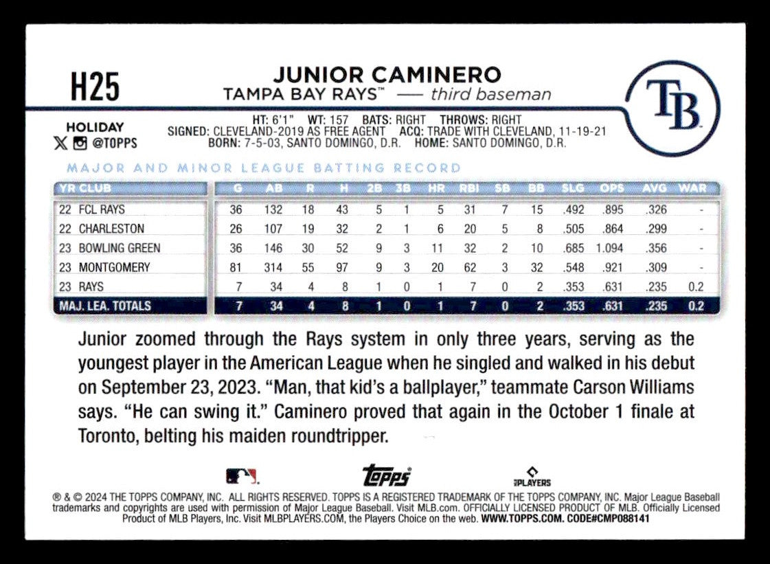This is a nice example of a 2024 Topps Holiday #H25 Junior Caminero