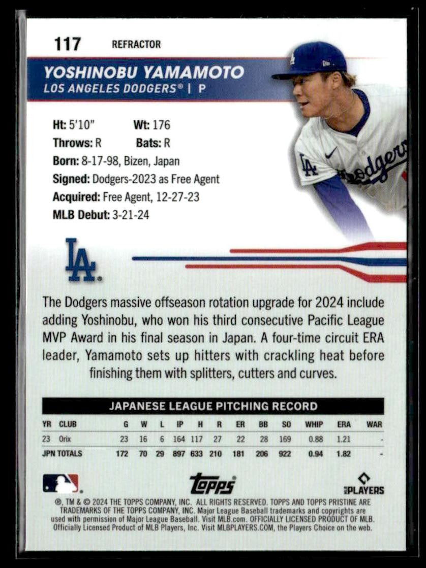 This is a sharp example of the 2024 Topps Pristine #117 featuring Yoshinobu Yamamoto.