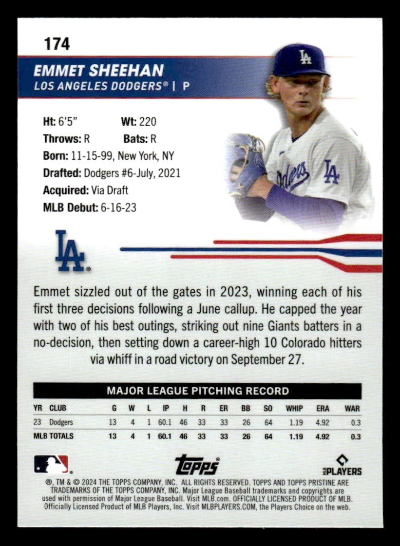 Emmet Sheehan played for the Los Angeles Dodgers in 2024, and this card is a standout from the Topps 2024 Topps Pristine release. Whether you're chasing rookies, SSPs, or building a premium collection, this card delivers.