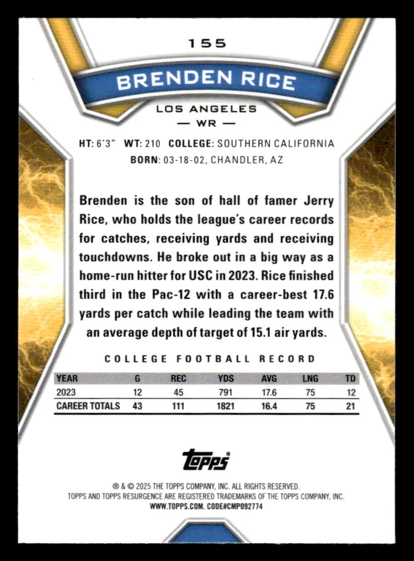 This is a sharp example of the 2024 Topps Resurgence #155 featuring Brenden Rice.