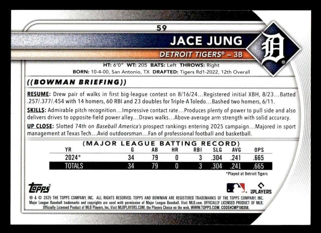 This is a nice example of a 2025 Bowman #59 Jace Jung