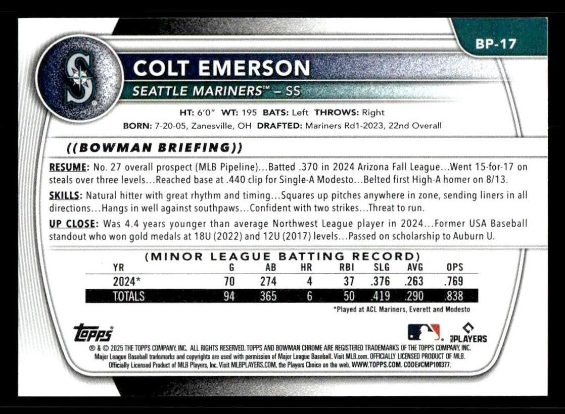 This is a nice example of a 2025 Bowman #BP-17 Colt Emerson Prospects