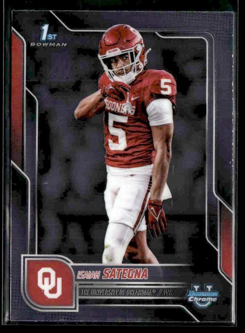 π₯ A premium trading card from the ο»Ώ 2025 Bowman University Chrome release featuring Isaiah Sategna of the Oklahoma Sooners.