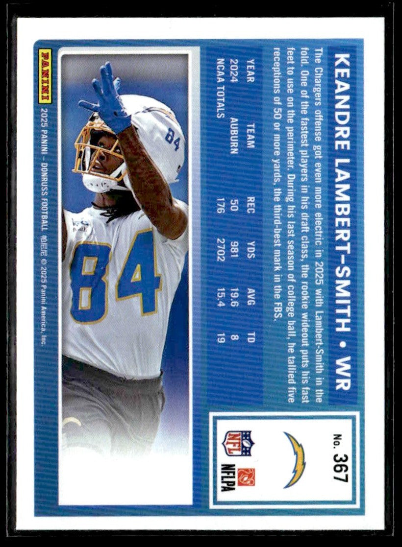 π₯ A premium trading card from the ο»Ώ 2025 Donruss release featuring Keandre Lambert-Smith of the Los Angeles Chargers.