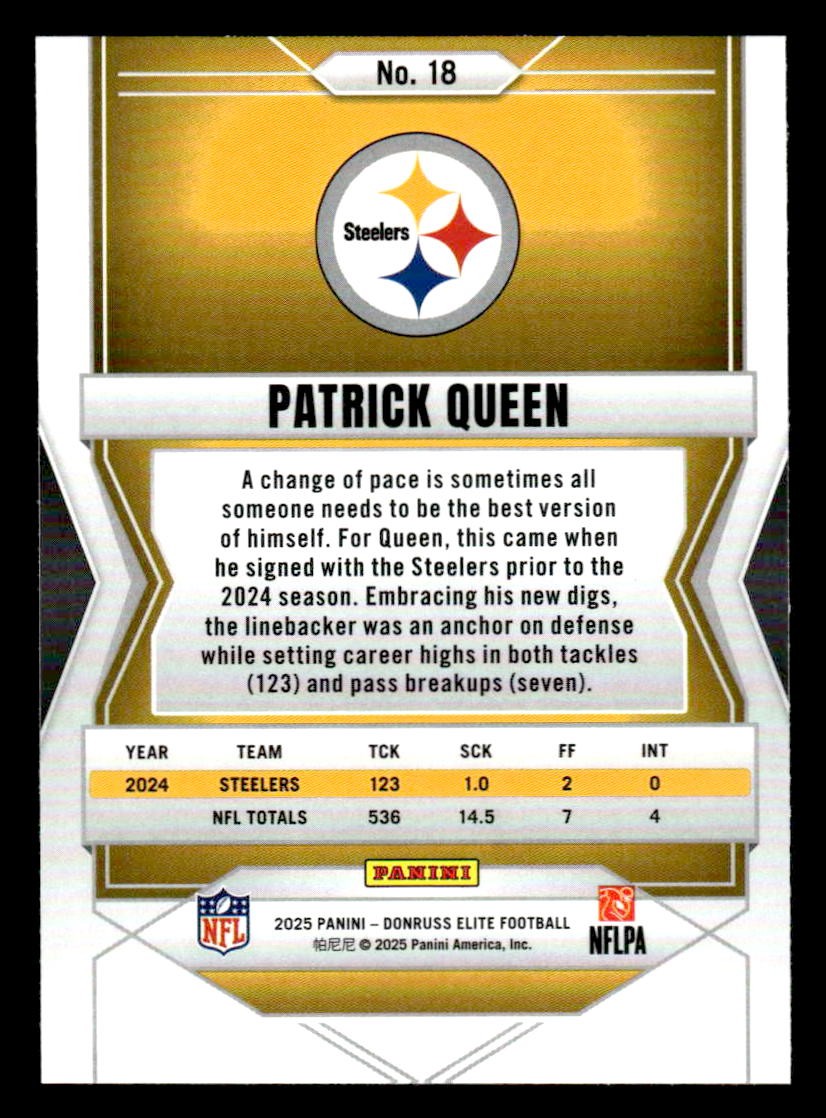 This is a sharp example of the 2025 Donruss Elite #18 featuring Patrick Queen.