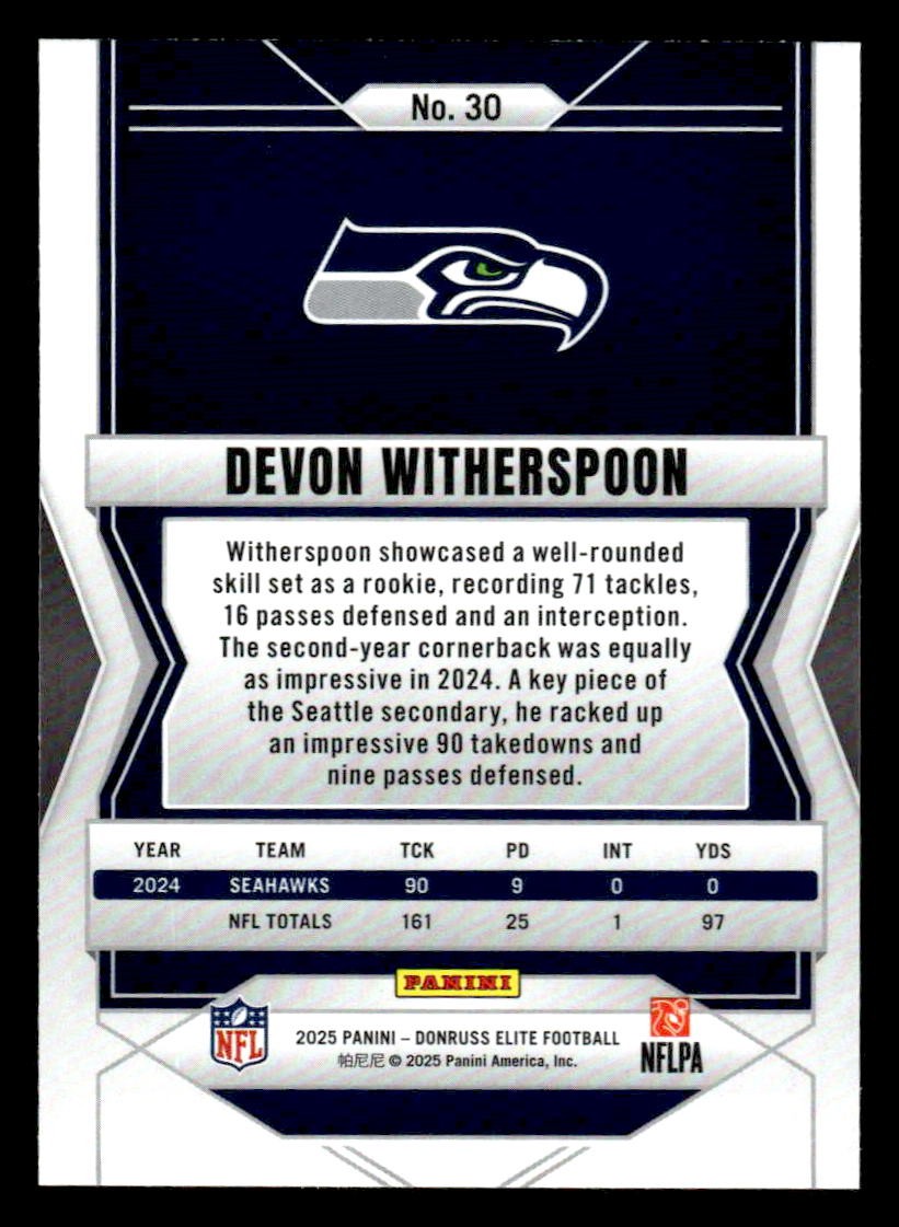 This is a sharp example of the 2025 Donruss Elite #30 featuring Devon Witherspoon.