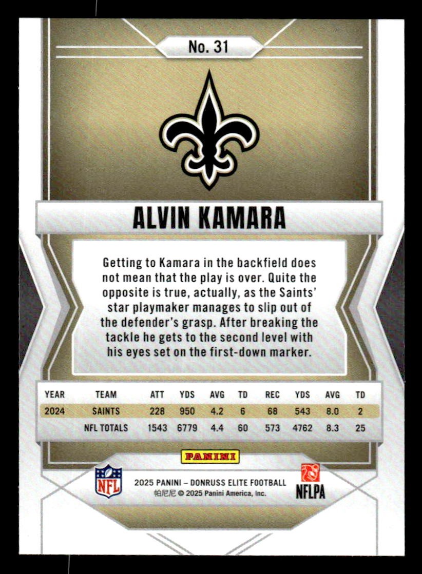 This is a sharp example of the 2025 Donruss Elite #31 featuring Alvin Kamara.