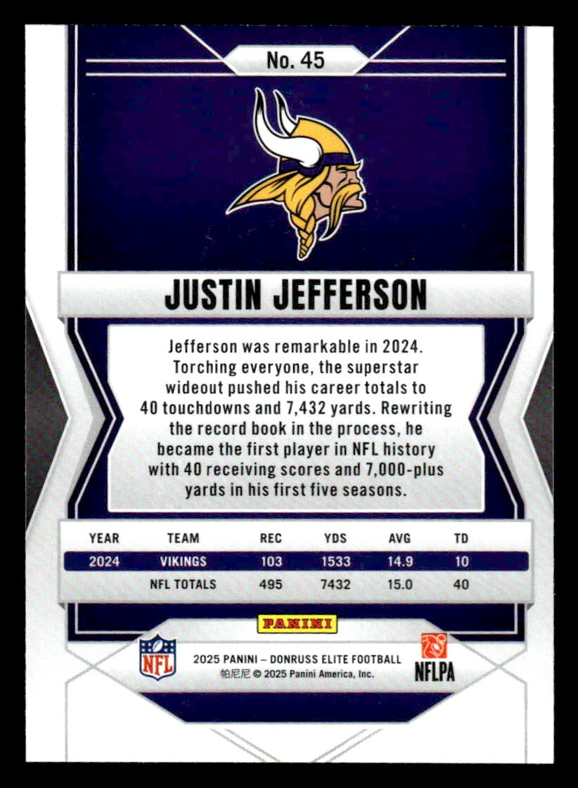 This is a sharp example of the 2025 Donruss Elite #45 featuring Justin Jefferson.