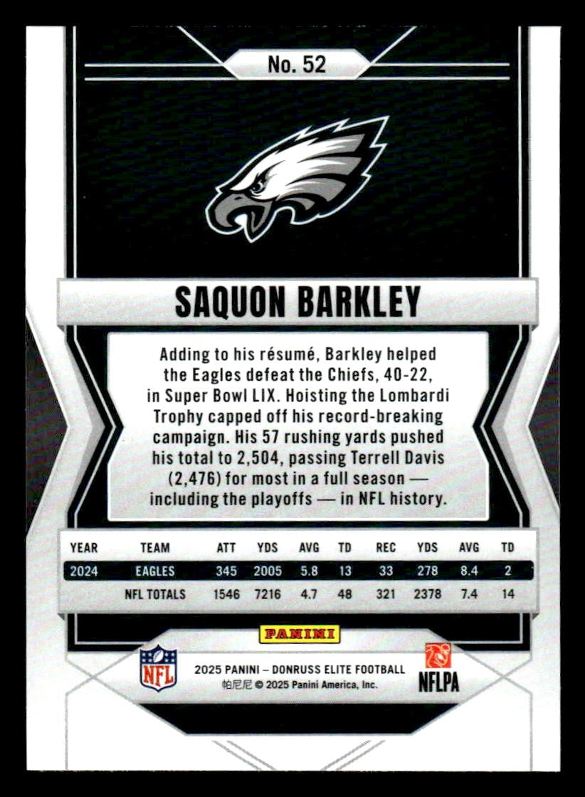 This is a sharp example of the 2025 Donruss Elite #52 featuring Saquon Barkley.