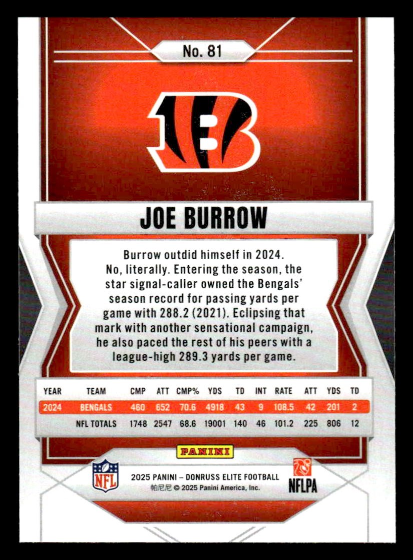 This is a sharp example of the 2025 Donruss Elite #81 featuring Joe Burrow.