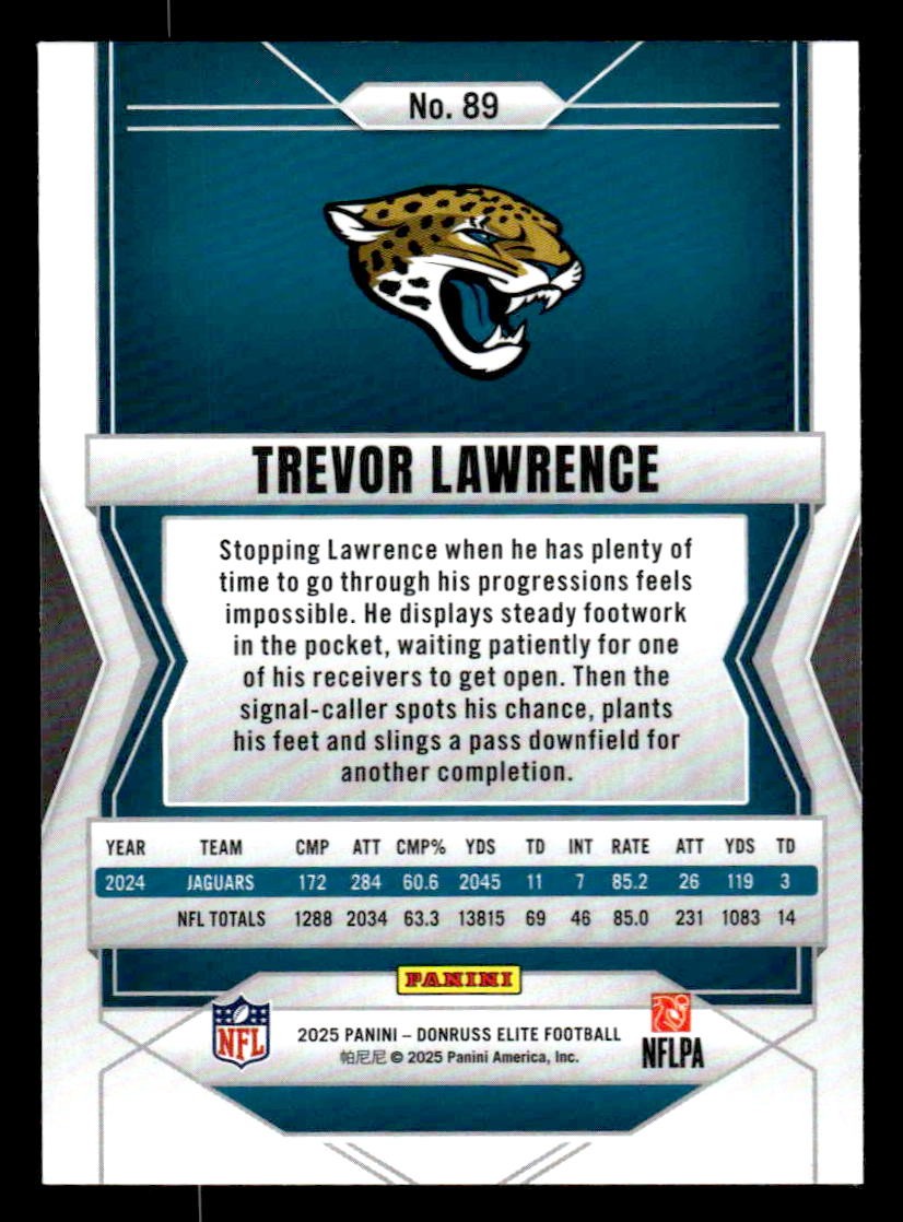 This is a sharp example of the 2025 Donruss Elite #89 featuring Trevor Lawrence.