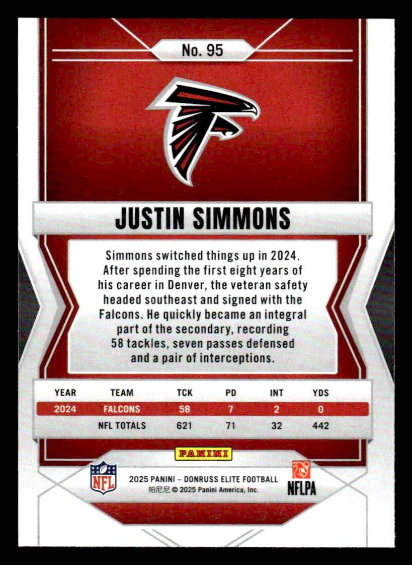 Justin Simmons played for the Atlanta Falcons in 2025, and this card is a standout from the Donruss 2025 Donruss Elite release. Whether you're chasing rookies, SSPs, or building a premium collection, this card delivers.