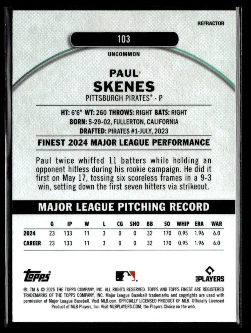 Paul Skenes played for the Pittsburgh Pirates in 2025, and this card is a standout from the 2025 Finest release. Whether you're chasing rookies, SSPs, or building a premium collection, this card delivers.