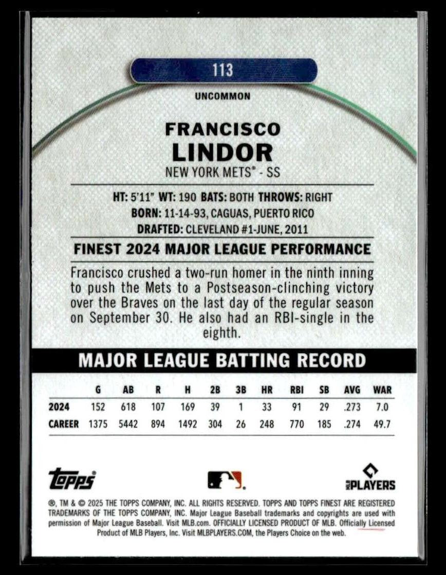 Francisco Lindor played for the New York Mets in 2025, and this card is a standout from the 2025 Finest release. Whether you're chasing rookies, SSPs, or building a premium collection, this card delivers.