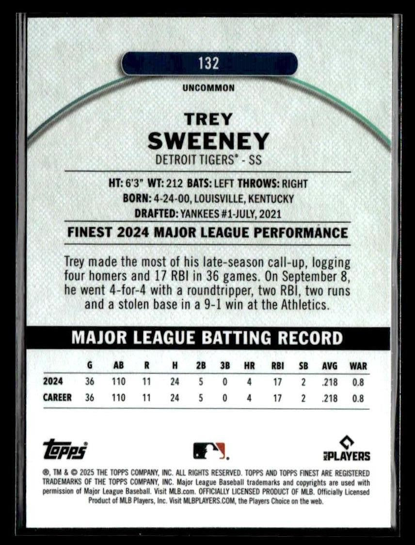 Trey Sweeney played for the Detroit Tigers in 2025, and this card is a standout from the 2025 Finest release. Whether you're chasing rookies, SSPs, or building a premium collection, this card delivers.