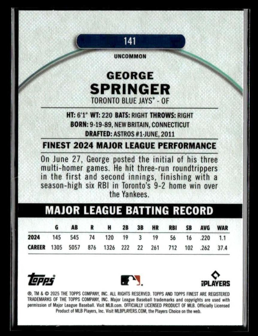 This is a sharp example of the 2025 Finest #141 featuring George Springer.