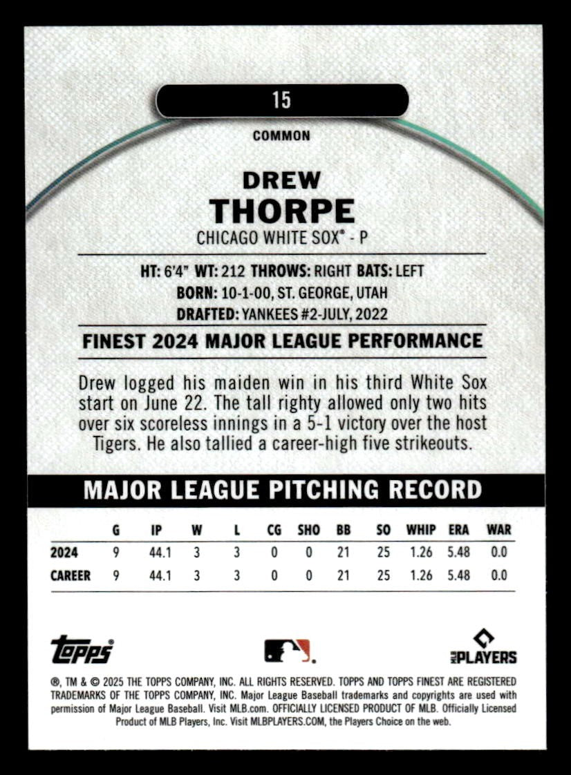Drew Thorpe played for the Chicago White Sox in 2025, and this card is a standout from the 2025 Finest release. Whether you're chasing rookies, SSPs, or building a premium collection, this card delivers.