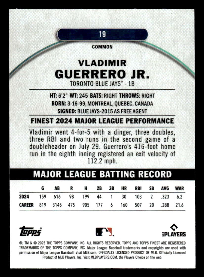 This is a sharp example of the 2025 Finest #19 featuring Vladimir Guerrero Jr..