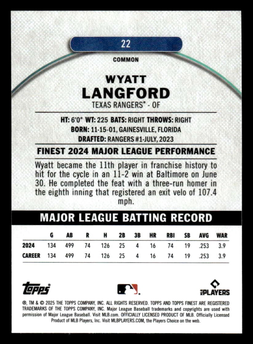 Wyatt Langford played for the Texas Rangers in 2025, and this card is a standout from the 2025 Finest release. Whether you're chasing rookies, SSPs, or building a premium collection, this card delivers.