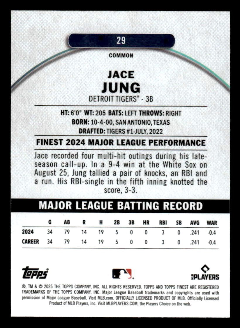 Jace Jung played for the Detroit Tigers in 2025, and this card is a standout from the 2025 Finest release. Whether you're chasing rookies, SSPs, or building a premium collection, this card delivers.