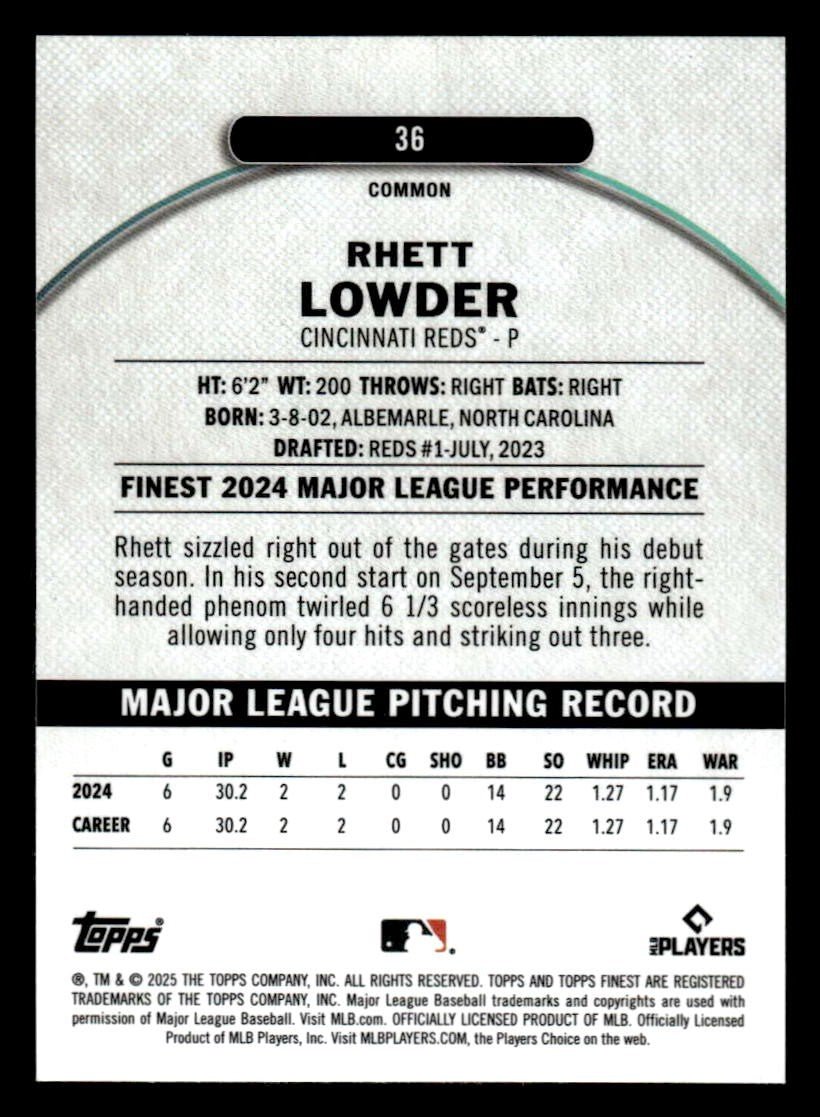 This is a sharp example of the 2025 Finest #36 featuring Rhett Lowder.