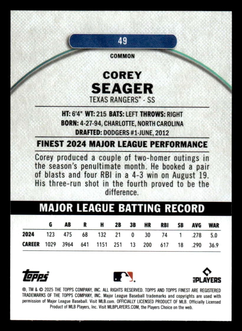This is a sharp example of the 2025 Finest #49 featuring Corey Seager.