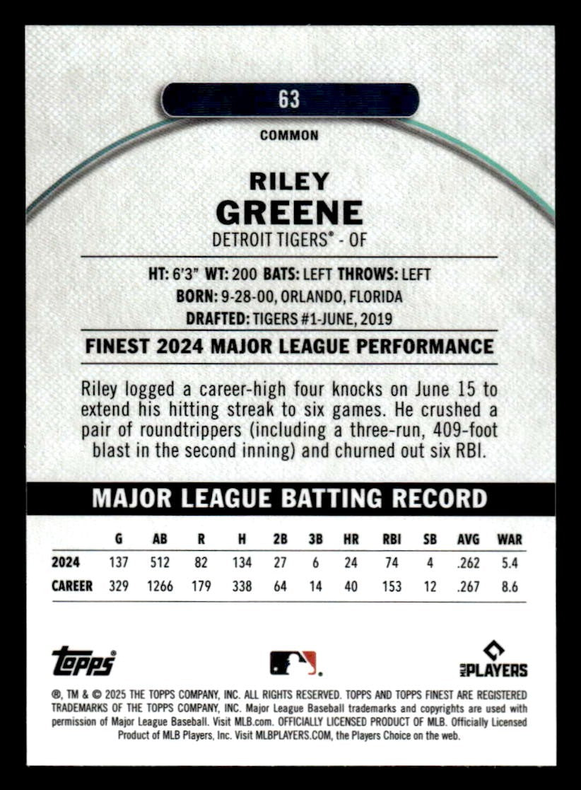 This is a sharp example of the 2025 Finest #63 featuring Riley Greene.