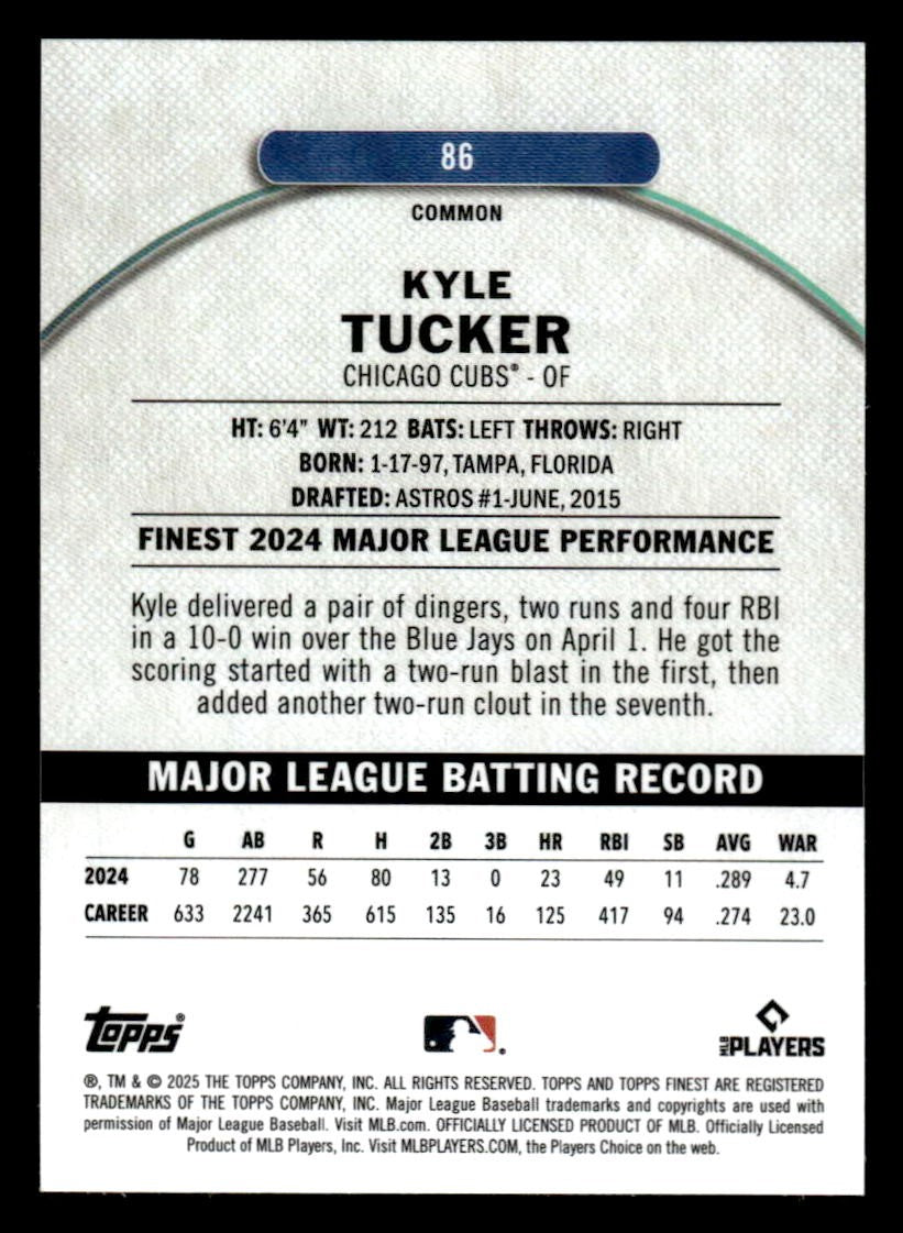 This is a sharp example of the 2025 Finest #86 featuring Kyle Tucker.