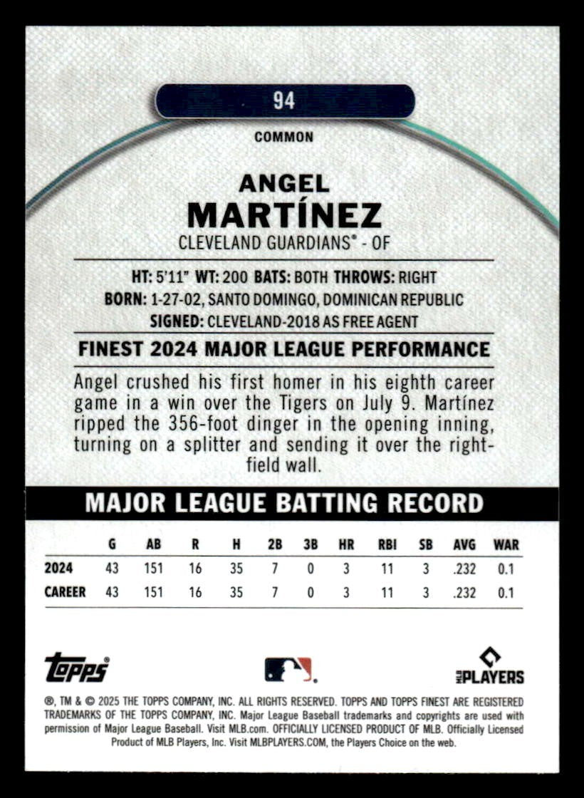 Angel Martínez played for the Cleveland Guardians in 2025, and this card is a standout from the 2025 Finest release. Whether you're chasing rookies, SSPs, or building a premium collection, this card delivers.