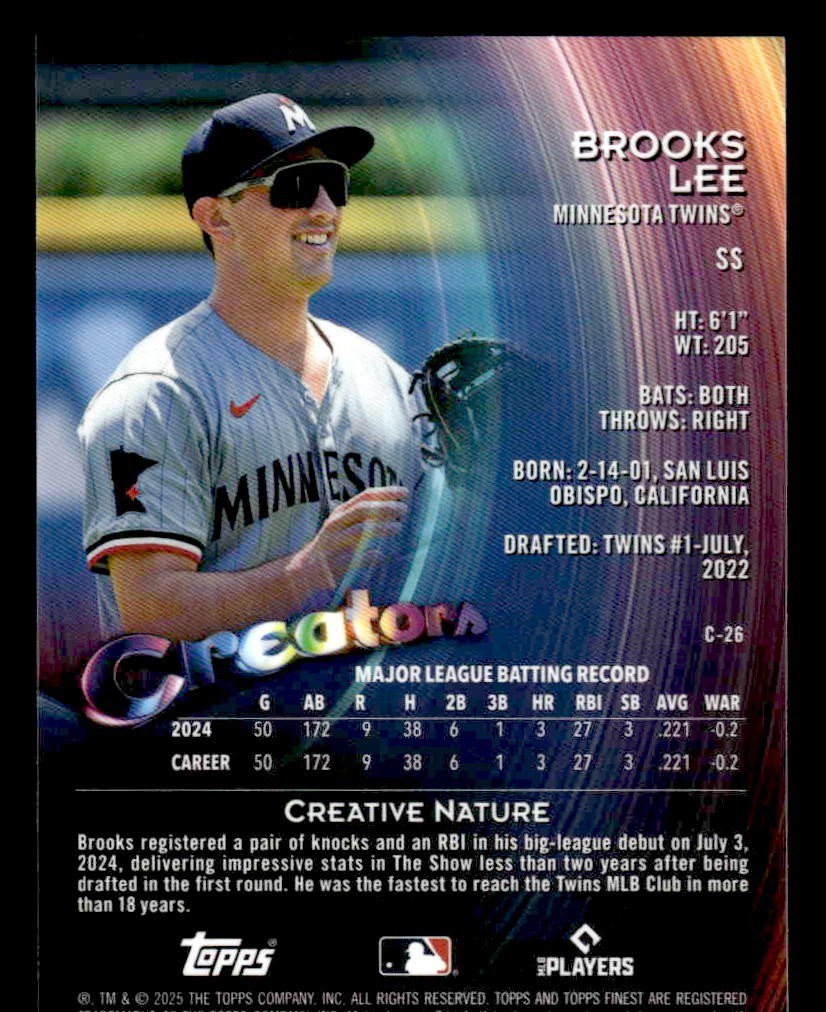 Brooks Lee played for the Minnesota Twins in 2025, and this card is a standout from the 2025 Finest release. Whether you're chasing rookies, SSPs, or building a premium collection, this card delivers.