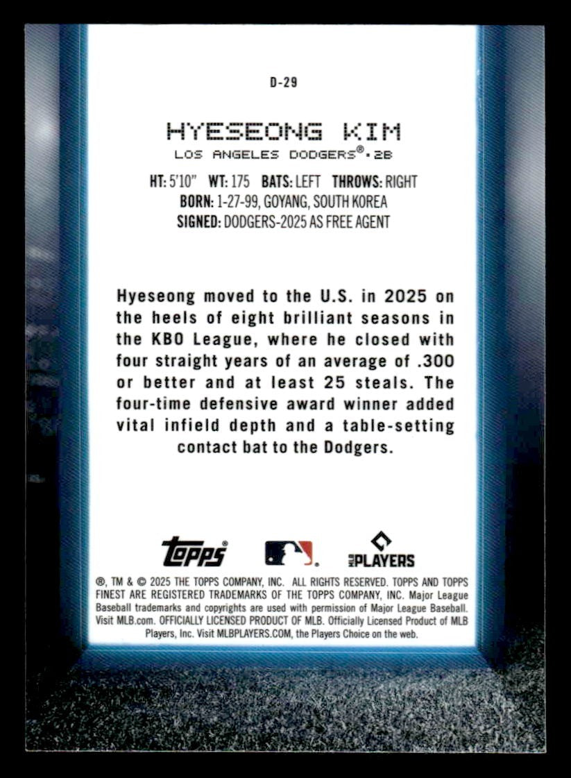 This is a sharp example of the 2025 Finest #D-29 featuring Hyeseong Kim.