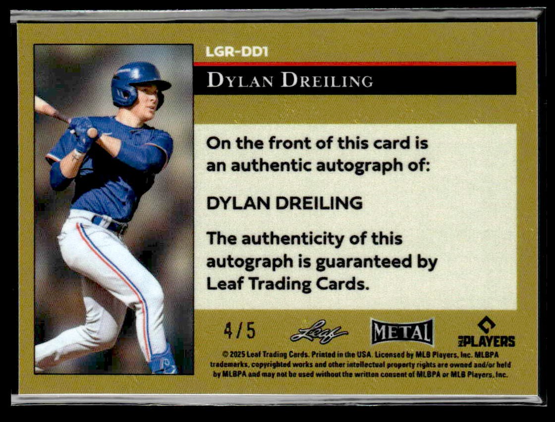 This is a sharp example of the 2025 Leaf Metal #LGR-DD1 featuring Dylan Dreiling.