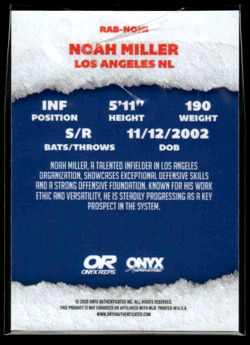 This is a sharp example of the 2025 Onyx Rips #RAB-NOMI featuring Noah Miller.