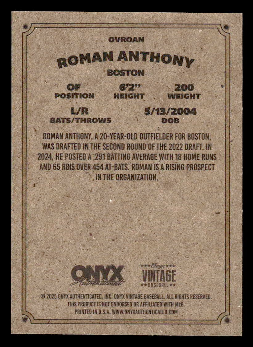Roman Anthony played for the Boston Red Sox in 2025, and this card is a standout from the 2025 Onyx Vintage release. Whether you're chasing rookies, SSPs, or building a premium collection, this card delivers.