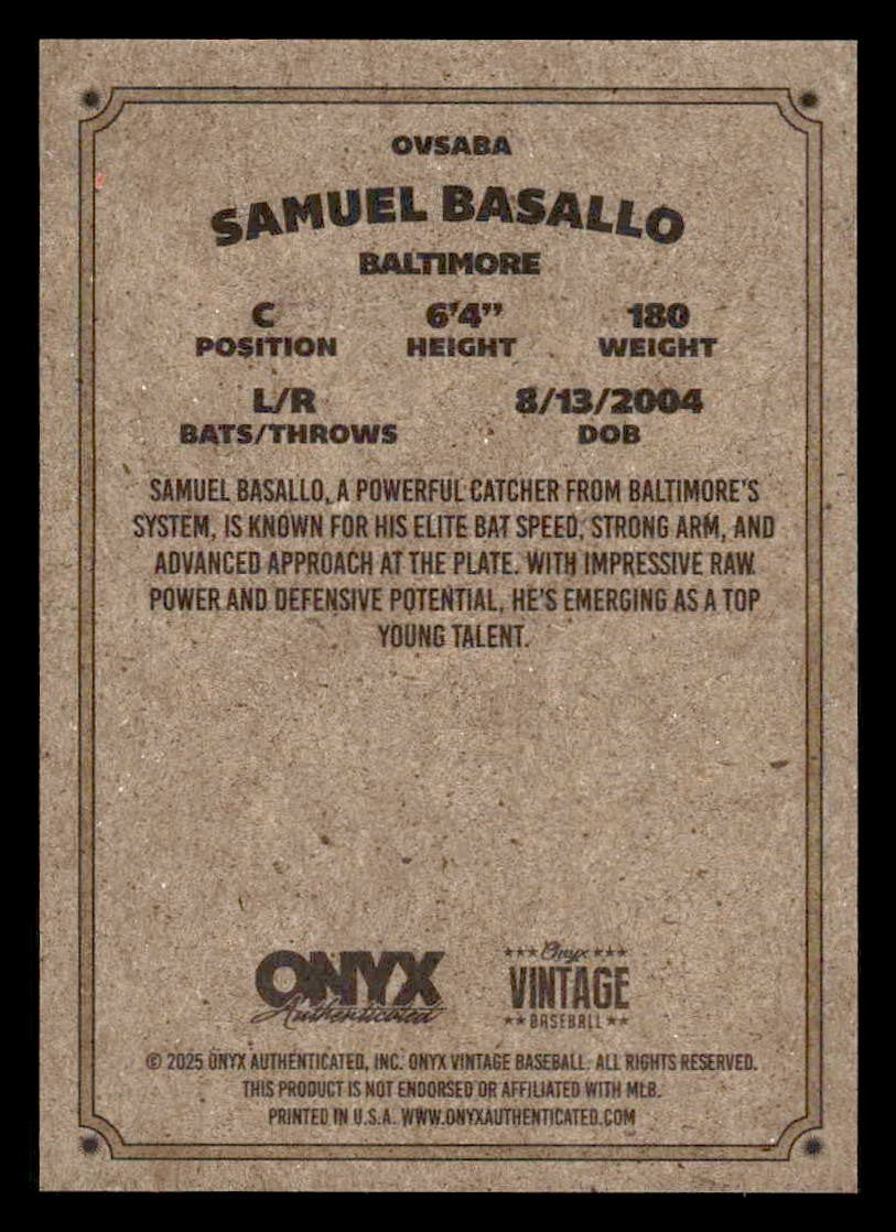 Samuel Basallo played for the Baltimore Orioles in 2025, and this card is a standout from the 2025 Onyx Vintage release. Whether you're chasing rookies, SSPs, or building a premium collection, this card delivers.