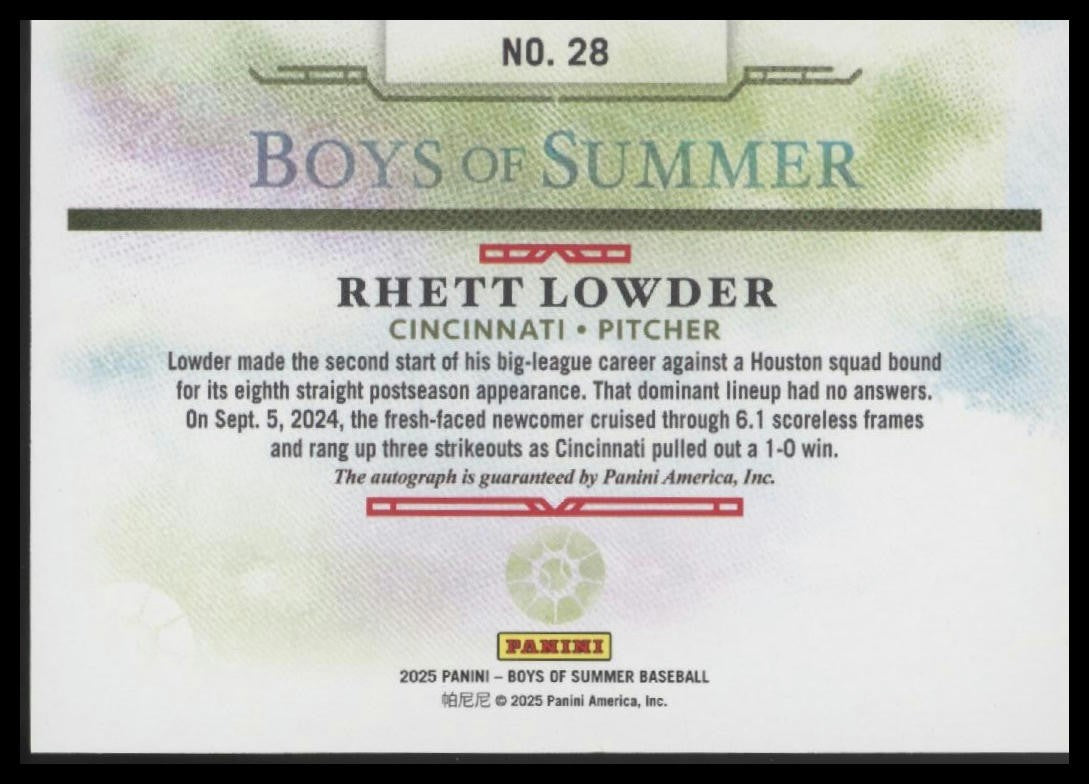 This is a sharp example of the 2025 Panini Boys of Summer #28 featuring Rhett Lowder.