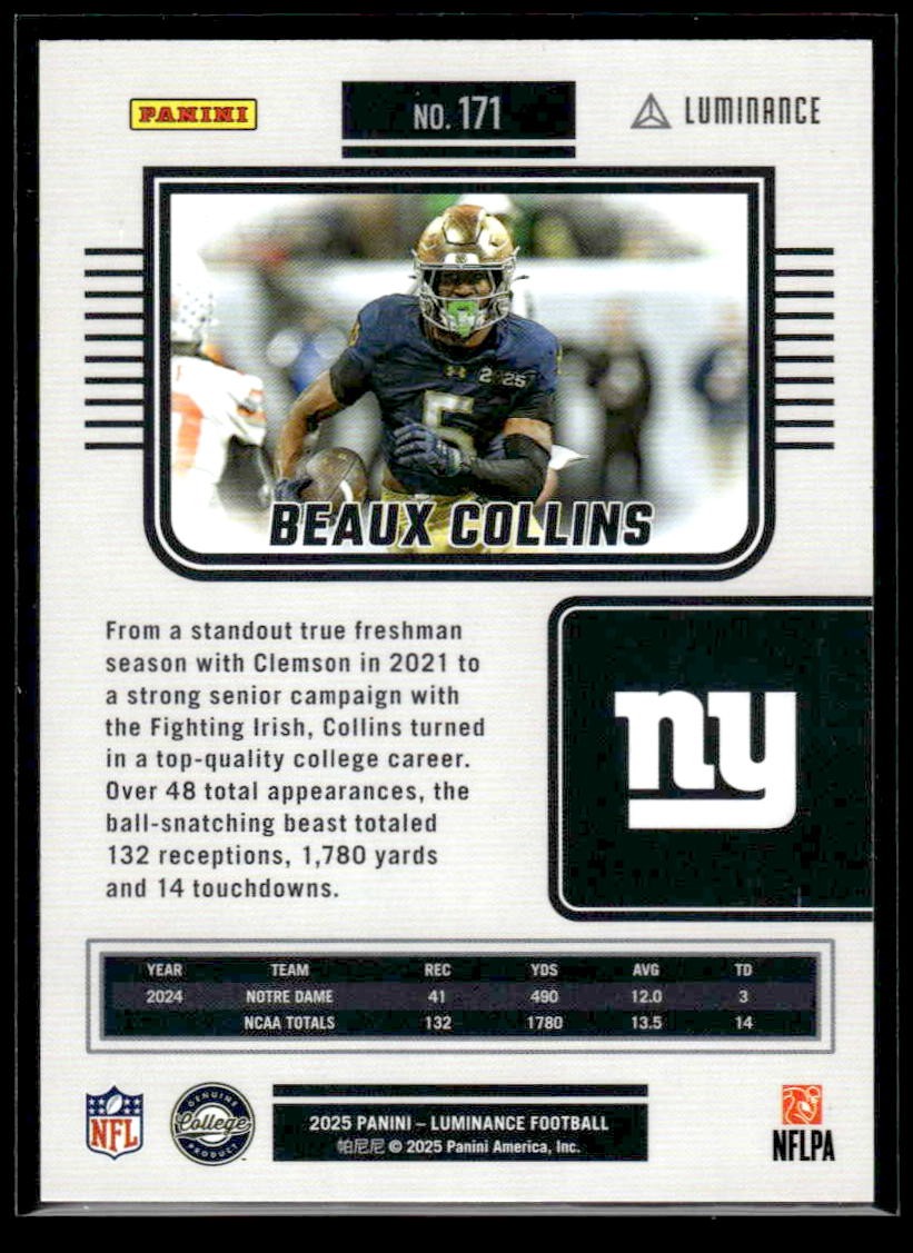 Beaux Collins played for the New York Giants in 2025, and this card is a standout from the Panini 2025 Panini Luminance release. Whether you're chasing rookies, SSPs, or building a premium collection, this card delivers.