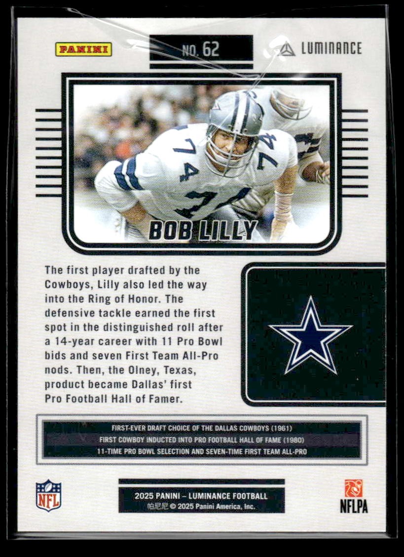 Bob Lilly played for the Dallas Cowboys in 2025, and this card is a standout from the Panini 2025 Panini Luminance release. Whether you're chasing rookies, SSPs, or building a premium collection, this card delivers.
