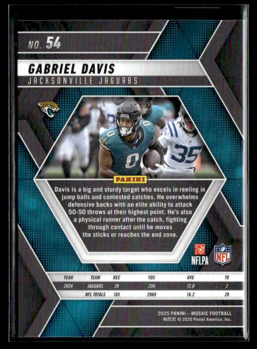 π₯ A premium trading card from the ο»Ώ 2025 Panini Mosaic release featuring Gabriel Davis of the Jacksonville Jaguars.