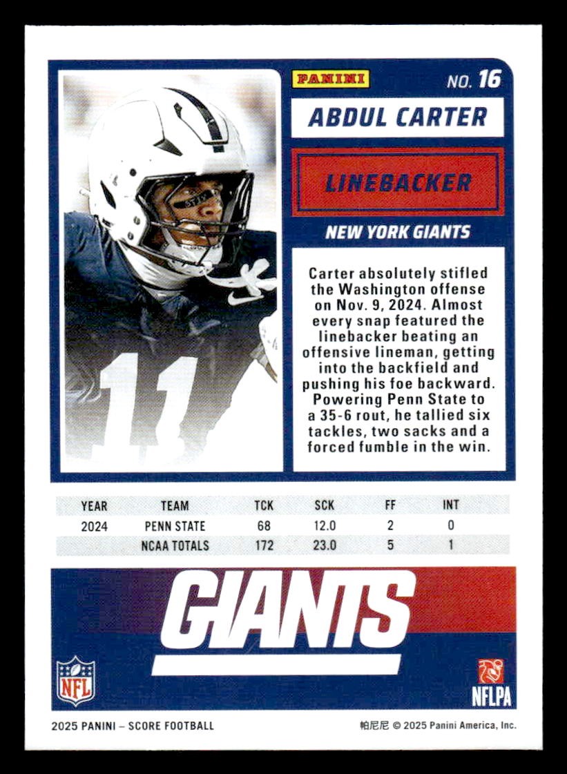 Abdul Carter played for the New York Giants in 2025, and this card is a standout from the Score 2025 Score release. Whether you're chasing rookies, SSPs, or building a premium collection, this card delivers.