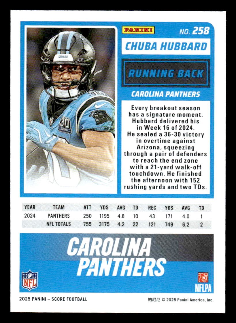This is a sharp example of the 2025 Score #258 featuring Chuba Hubbard.